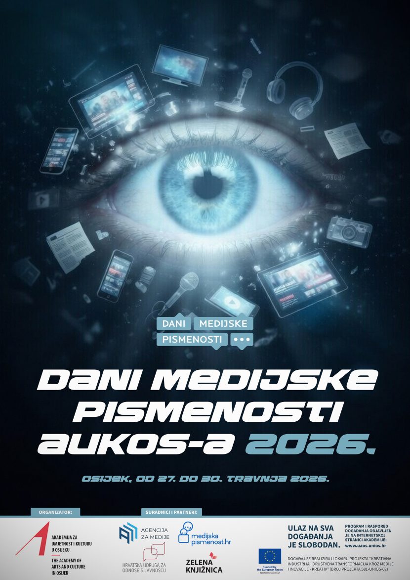 Od ponedjeljka, 27. travnja, do četvrtka, 30. travnja 2026., održat će se Dani medijske pismenosti AUKOS-a 2026. koje organizira Akademija za umjetnost i kulturu u Osijeku (AUKOS) – Odsjek za kulturu, medije i menadžment, u suradnji s partnerima.