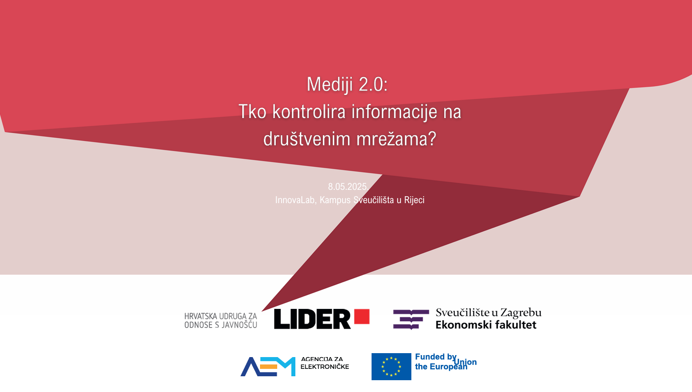 Pozivamo vas na okrugli stol “Mediji 2.0.: Tko kontrolira informacije na društvenim mrežama” koji će se održati 8. svibnja 2025. godine u 17 sati u prostorijama Inovalaba, Kampus Sveučilišta u Rijeci (pored zgrade STEPRI, Ulica Radmile Matejčić 10).