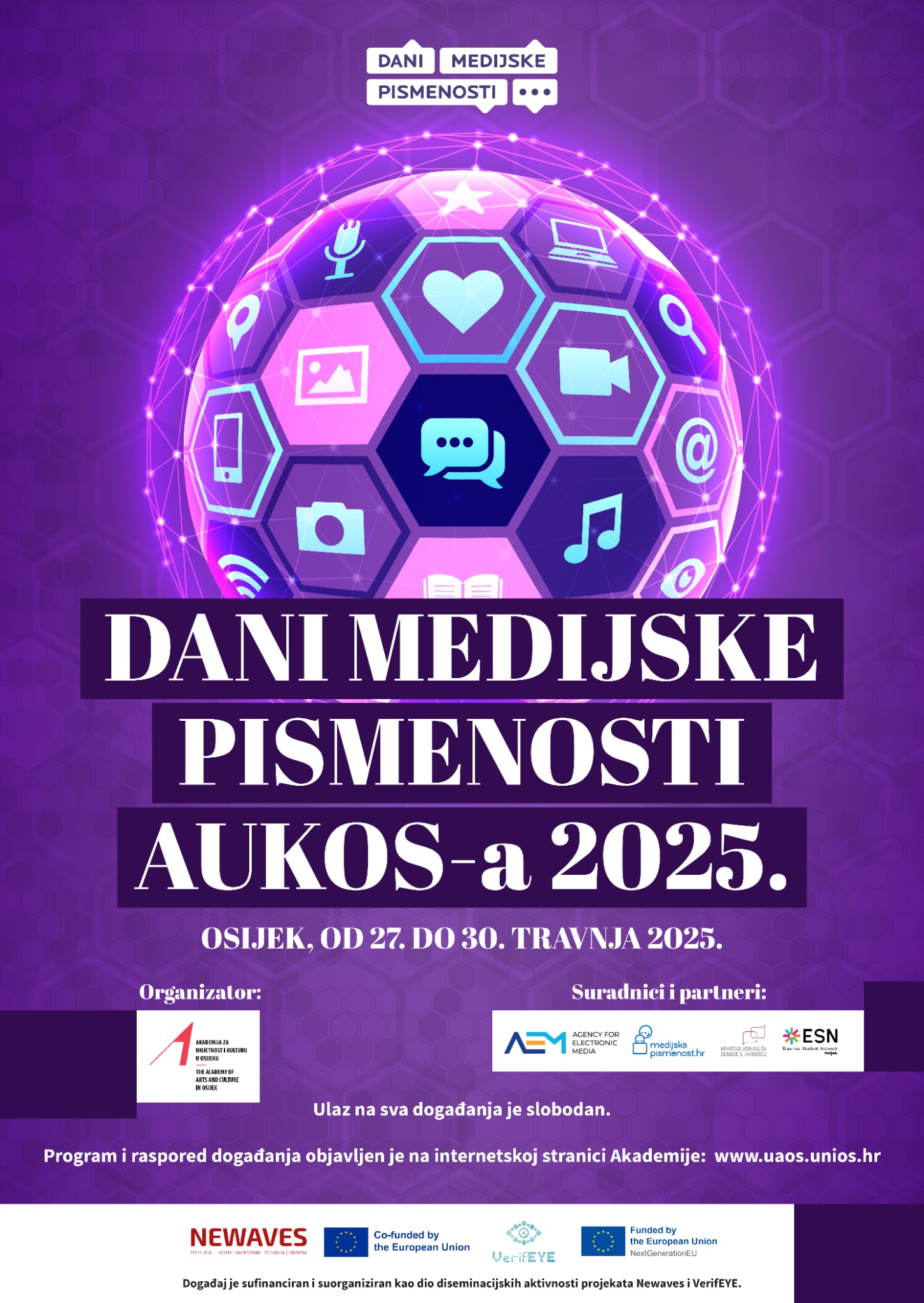 Od nedjelje, 27. travnja, do utorka, 30. travnja 2025., održat će se Dani medijske pismenosti AUKOS-a 2025. koje organizira Akademija za umjetnost i kulturu u Osijeku (AUKOS) – Odsjek za kulturu, medije i menadžment, u suradnji s partnerima.